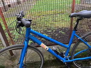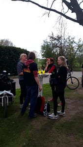 Wir anderen fuhren trotzdem erstmal den Panke-Radweg weiter, bis zur „Pankgräfin“. Bei diesem ersten Halt wurden die Fahrräder zunächst Union-standesgemäß verschönert und die farbenmäßig Abtrünnigen zurechtgewiesen, denn weinrot und blau sind nicht die Farben von Berlin!