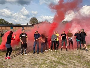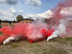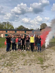 Aber das Ziel lag schon vor Augen und so kniffen wir die Arschbacken zusammen, um endlich bei der Bernauer Braugenossenschaft einzufallen. Hier mussten wir aber erst noch unseren unvergleichlichen Flitzpiepen-Charme spielen lassen, um kurz vor Toresch(l)uss noch unsere heißersehnte, goldgelbe und frisch gezapfte Belohnung zu bekommen. Letztlich ging es dann doch Runde um Runde. Unsere gute Stimmung zog auch den Nachbartisch in seinen Bann, so dass wir ihn schlussendlich 😉 als Fotografen für unser Gruppenbild mit Rauch & Zauberei gewinnen konnten. Als sich der Nebel legte, hieß es: auf, auf – zurück! Es ist Abend in der Stadt und der Tanz in den Mai in der Yolle wartete schon.
