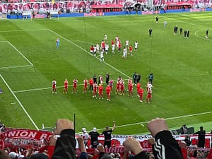 Die Aufstellung unserer Unioner war sehr defensiv, sogar eine Fünferkette… lies also vermuten, dass Union sich erst mal hinten reinstellt. Die ersten 15 Minuten wurde natürlich wieder geschwiegen im Unionblock und dann ging der Gesang wieder los und es stand noch 0:0. Die erste Halbzeit war ohne große Höhepunkte, wenig Torraumszenen, selbst der Gegner kam nicht durch, gut für uns. Wir freuten uns über das 0:0 zur Halbzeit. So konnte es weitergehen. In der zweiten Halbzeit wurde es doch etwas ereignisreicher, quirliger und spannend. Ein paar gelben Karten, Wechsel auf beiden Seiten und unser Fredi hielt doch tatsächlich einen Elfmeter und parierte noch bei 2-3 Freistößen super. Der Mann des Tages. Es blieb beim hochverdienten Unentschieden, wir waren happy, feierten unsere Helden und stellten fest, dass sich der Tagesausritt gelohnt hatte.