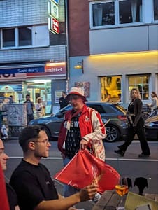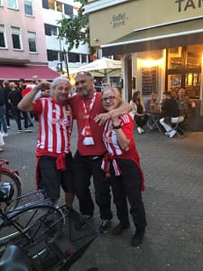 Es wurde des Abends noch die eine und andere Kaschemme besucht, irgendwo spielte jemand Klavier mitten auf der Straße und TT. wurde stolzer Besitzer einer FC Köln-Fahne nebst Schal im Tausch gegen unsere begehrten Flitzpiepen- und Unionaufkleber.