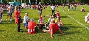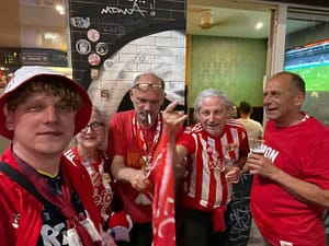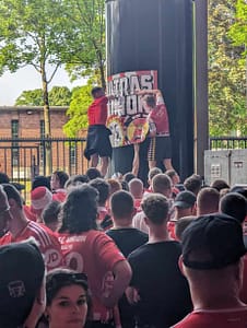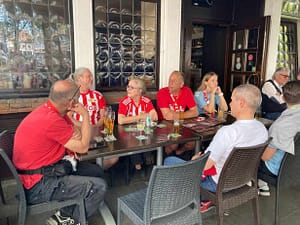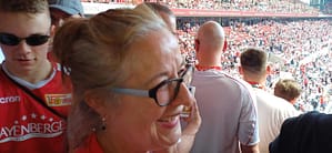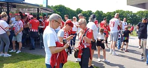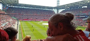 Gemeinsam zogen wir los zum Spielort. Die Tram war brechend voll. Überlegungen den Weg per pedes zu bewältigen, wurden rigoros abgelehnt. Zu weit. Egal, wir quetschten uns zu anderen Rotgewandeten in die Bahn, um später in Stadionnähe wieder herausgeschoben zu werden.