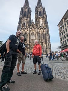 Der nächste Morgen begrüßte uns mit herrlich kräftigen Kaffee und frischen, reichlich und kreativ belegten Brötchen. So langsam stieg die Spannung. Es gab schließlich noch etwas zu erledigen in Kölle. Bei herrlichem Sommerwetter also auf in die Stadt, wieder über diesen Fluss, an der Kirche VORBEI!!!, die Innenstadt durchquert auf der Suche nach einem lauschigen Örtchen mit Getränkeangebot. Dies wurde alsbald gefunden und diente dann auch als Treffpunkt mit weiteren Flitzpiepen und Sympathisanten. Zu uns gesellten sich B. aus H. nebst Begleitung und F.´s ebenso junge wie charmante Verwandte.