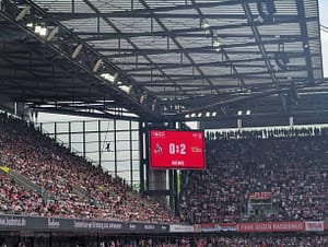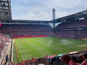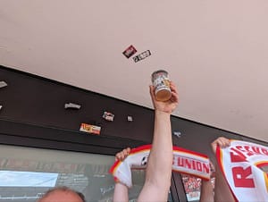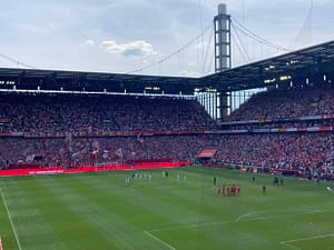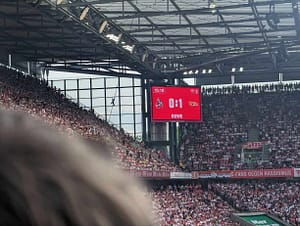 Wohlwissend, dass es im Gästeblock wie immer wohl nur Voltfreies zu erwerben geben wird, hielten wir uns noch an Bierwagen der Gastgeber schadlos. War alles easy und ohne jegliche Probleme machbar. Auch auf Kölner Seite beste, galgenhumorgetränkte Stimmung bei schönstem Sonnenschein. Am Eingang zum Gästeblock war Totentanz und wir kamen umstandslos am entspannten Ordnungsdienst vorbei ins Stadion. Hat man alles schon ganz anders erlebt. Um der Sache dann noch die Krone aufzusetzen, welch positive Überraschung, wurde normales Kölsch feilgeboten. Da ließen sich TT. und L. nicht lange bitten und deckten sich mit reichlich Getränken ein. Es könnte ja später nichts mehr geben.